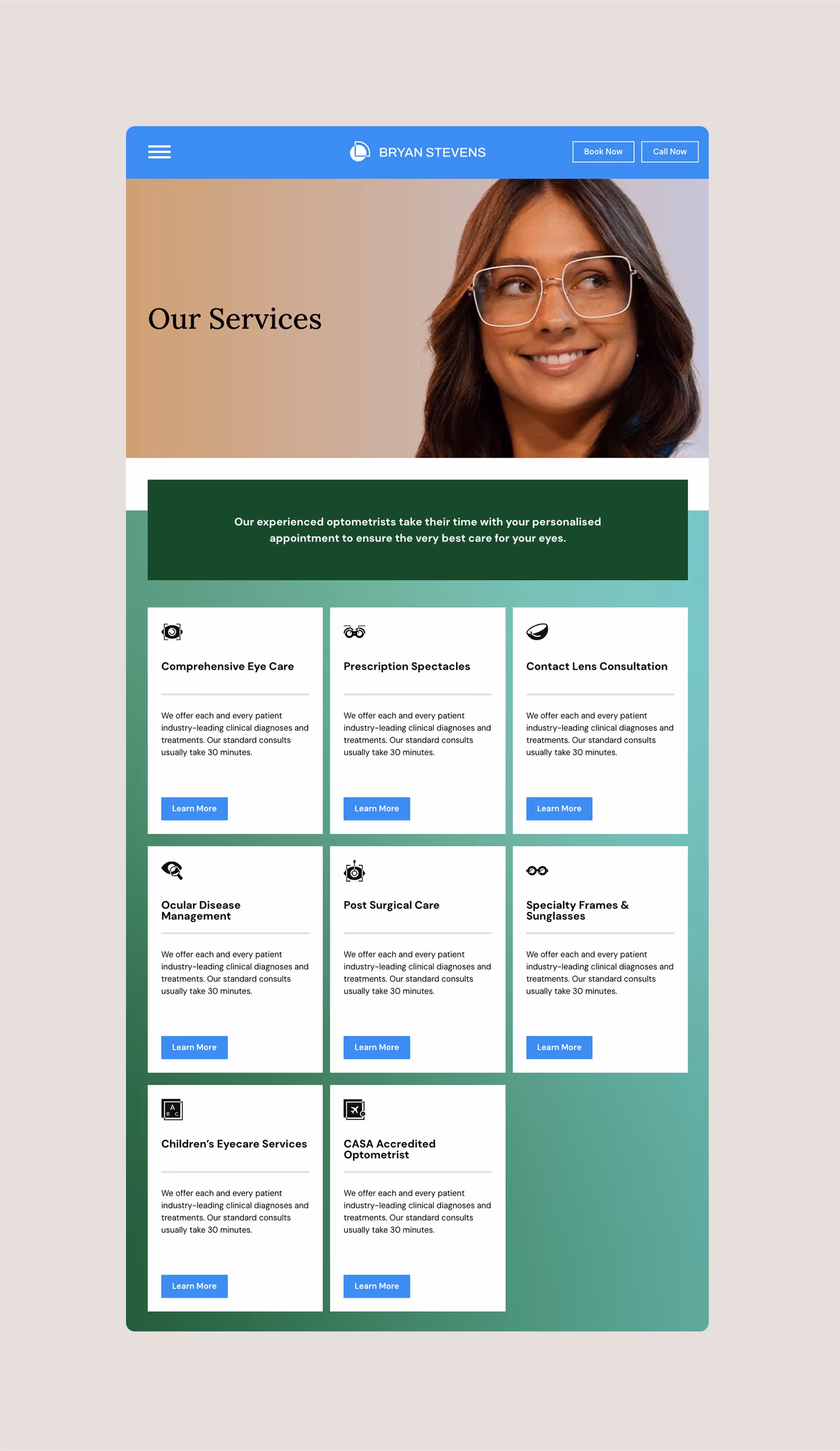 We created a dual-purpose website that brings together both sides of the Bryan Stevens brand. One side focuses on the optometry clinic, designed to make it easy for patients to book appointments, find service details, and get the support they need. The other side delivers a seamless e-commerce experience, where users can confidently browse and shop for designer eyewear.