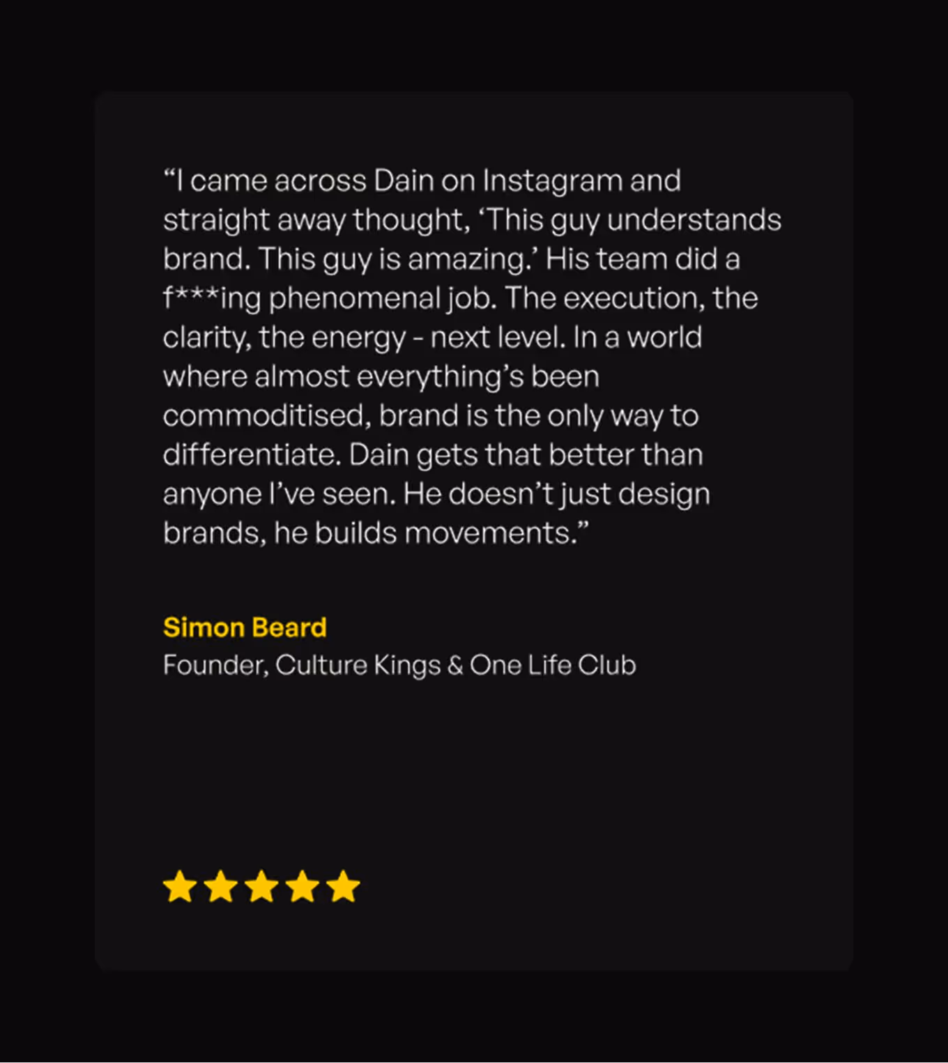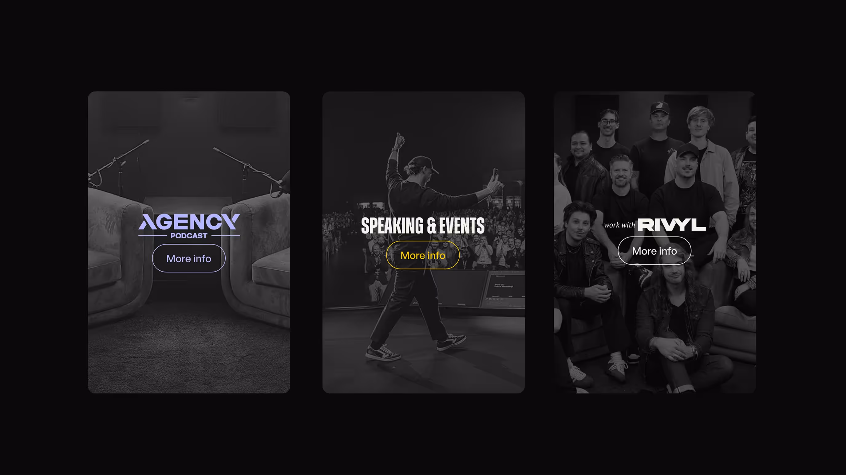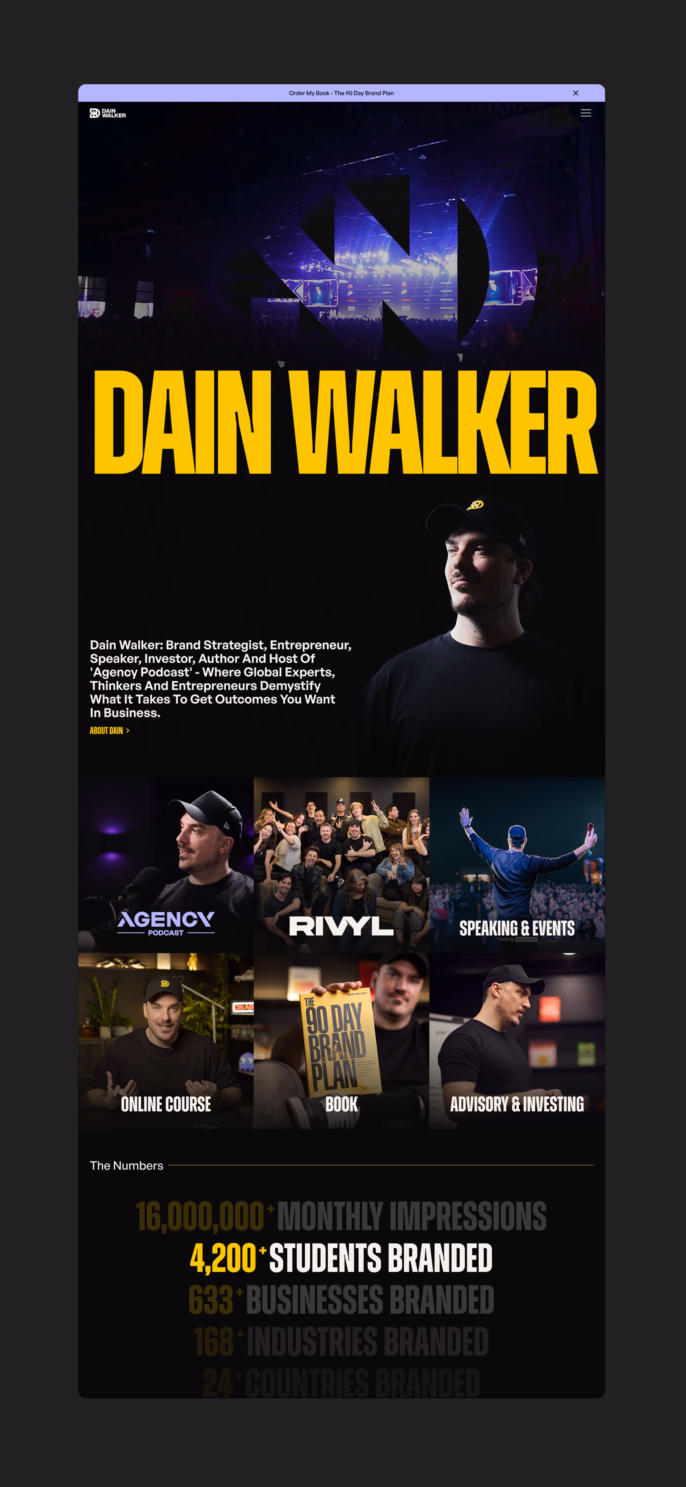 Rivyl partnered with Dain to evolve his personal brand into a multi-channel empire, spanning agency leadership, education, speaking, and publishing. The brand identity is built on high-performance energy; bold black and yellow visuals, dominant typography, and storytelling that positions Dain as a mentor, operator, and thought leader. Every touchpoint, from the website to the socials, was designed to capture attention, disrupt expectation, and drive action.