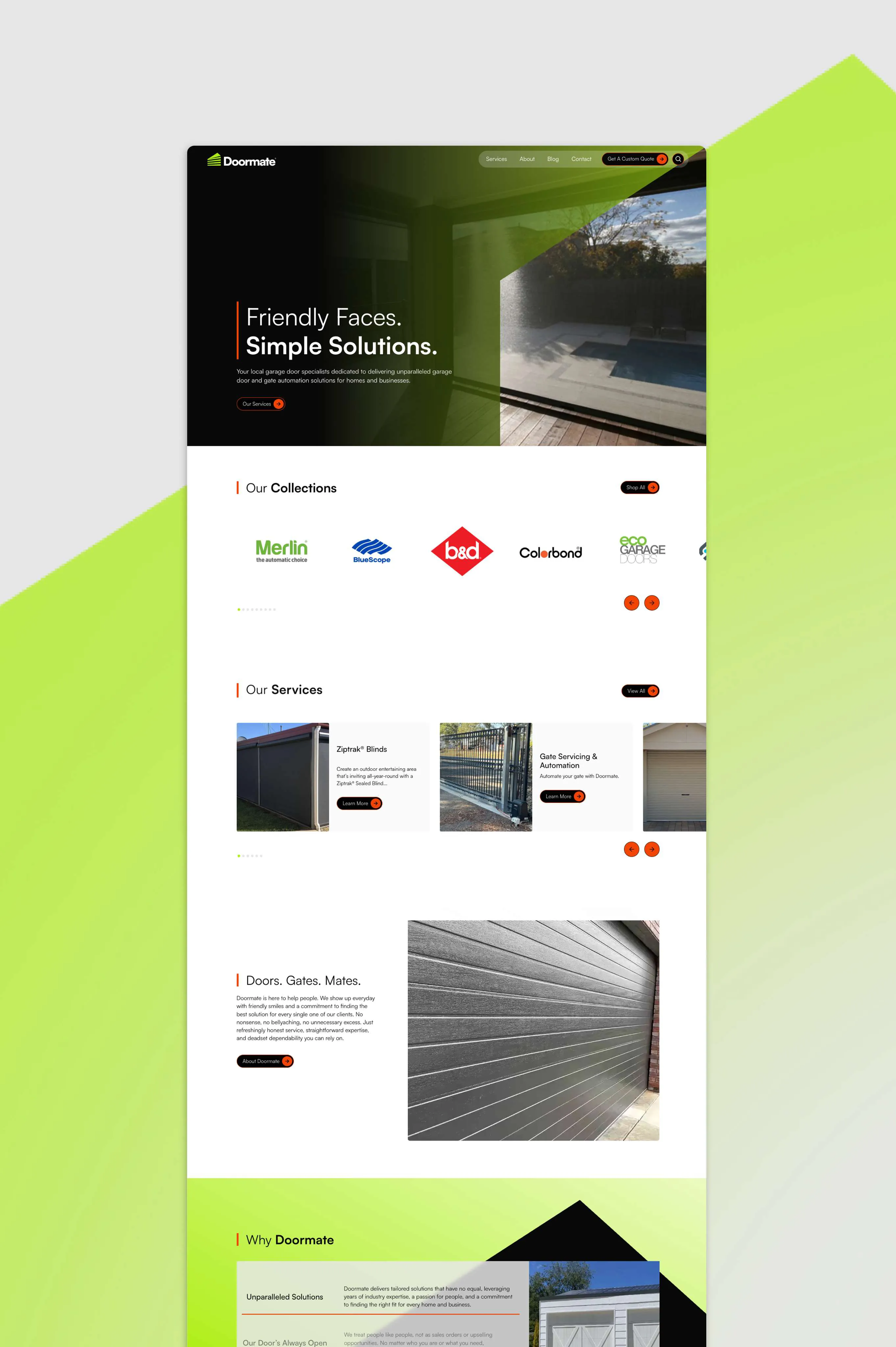 The website was designed to inspire confidence in Doormate’s services while showcasing their approachable personality. Clean, airy layouts and light colours create a friendly, professional feel, while subtle hover interactions add a modern touch. Bright lime green and orange accents guide users through the site, making information digestible and leading visitors toward the key goal: requesting a custom quote.