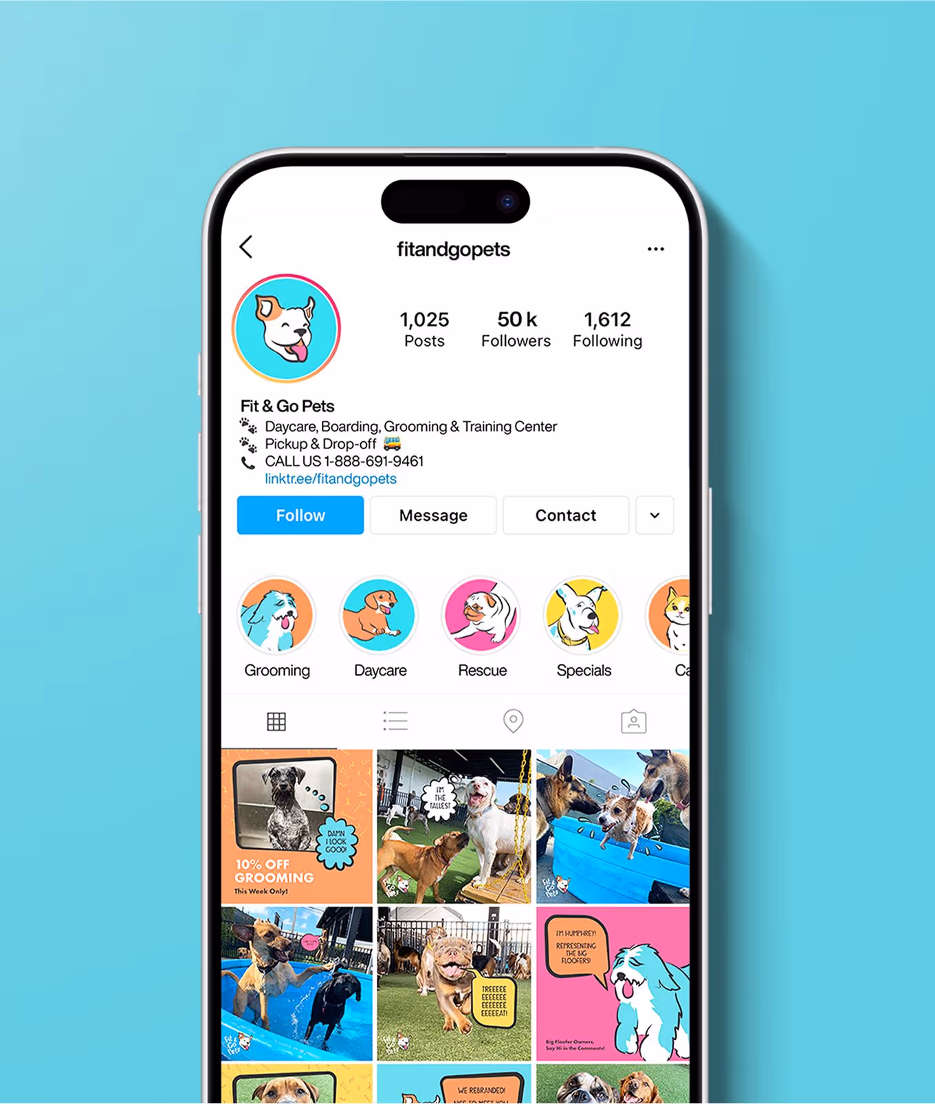 We made the dogs the voice of the brand, literally. With a full suite of speech bubbles and playful copy, Rosie and her crew could speak across signage, digital, social, and merch. The new tagline “Every Day’s a Ball” captured the joy of the experience, while witty, human-first messaging reflected the one-of-a-kind care that sets Fit & Go apart.