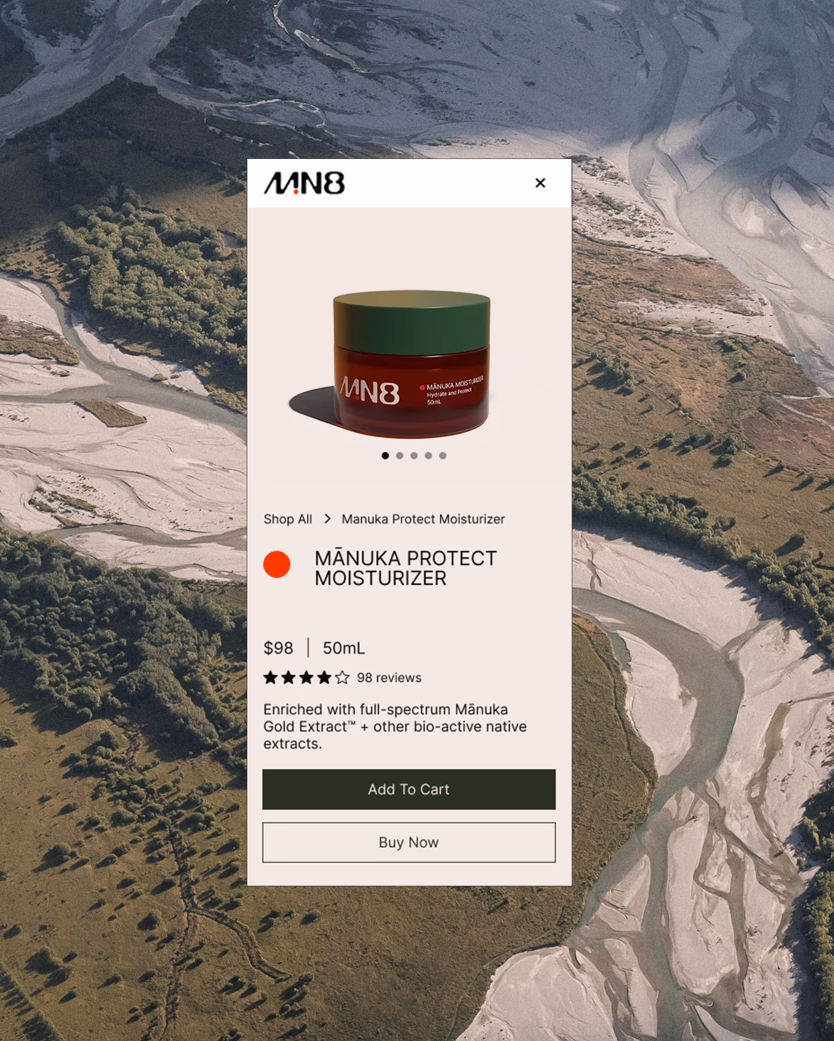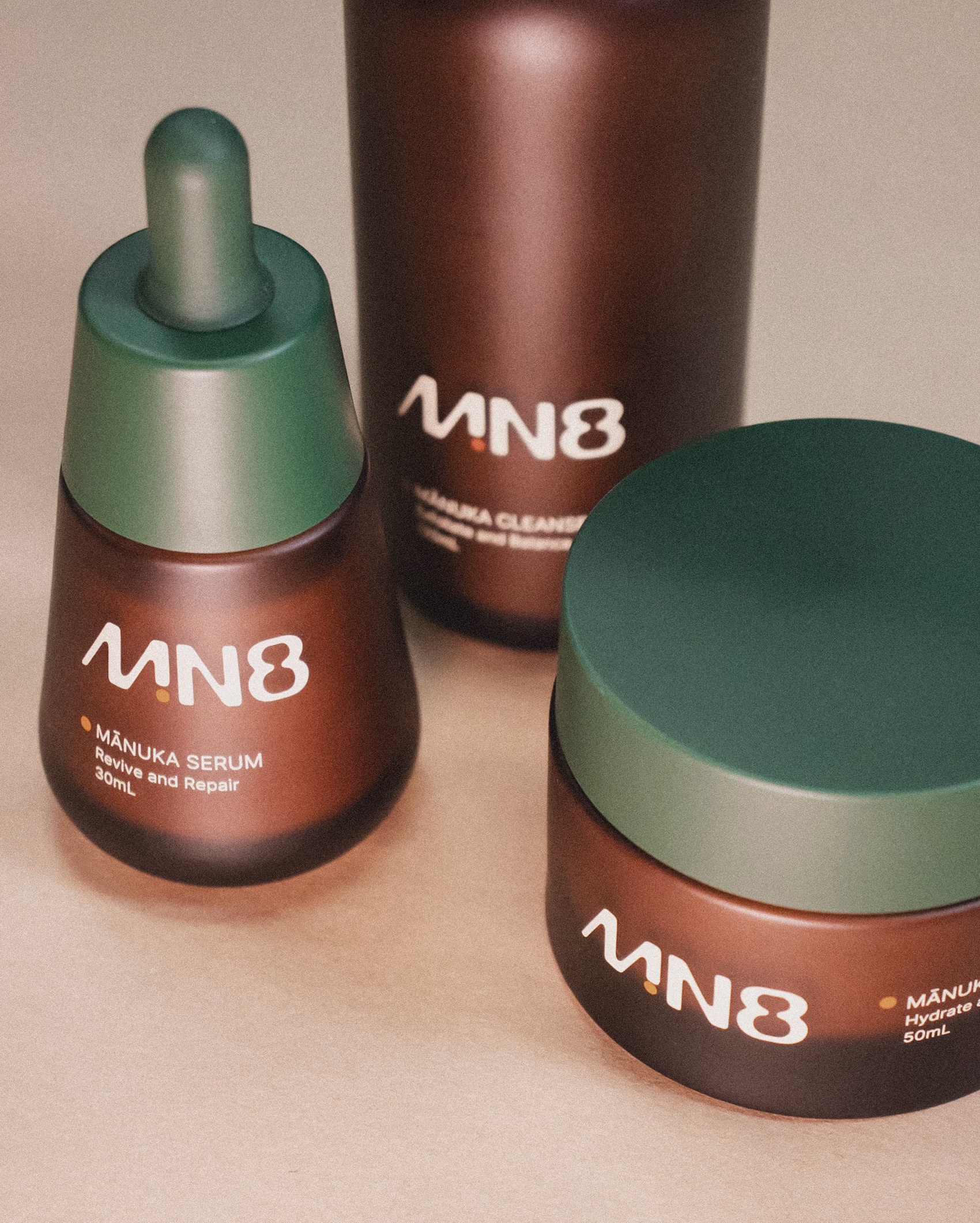 MN8 is a premium New Zealand skincare brand powered by full-spectrum Mānuka Gold Extract™. A potent, CO₂-extracted formulation developed from plants grown on a once-degraded Northland dairy farm, now fully regenerated. Built on a mission to restore land, skin and confidence, MN8 merges modern science with nature’s complexity to deliver high-performance skincare with real purpose. Our scope included brand strategy, naming, copy and voice, visual identity, packaging design, and the full e-commerce website. From the ground up, we shaped MN8’s bold, regenerative vision into a cohesive brand that feels premium, powerful and deeply connected to the land it comes from.
