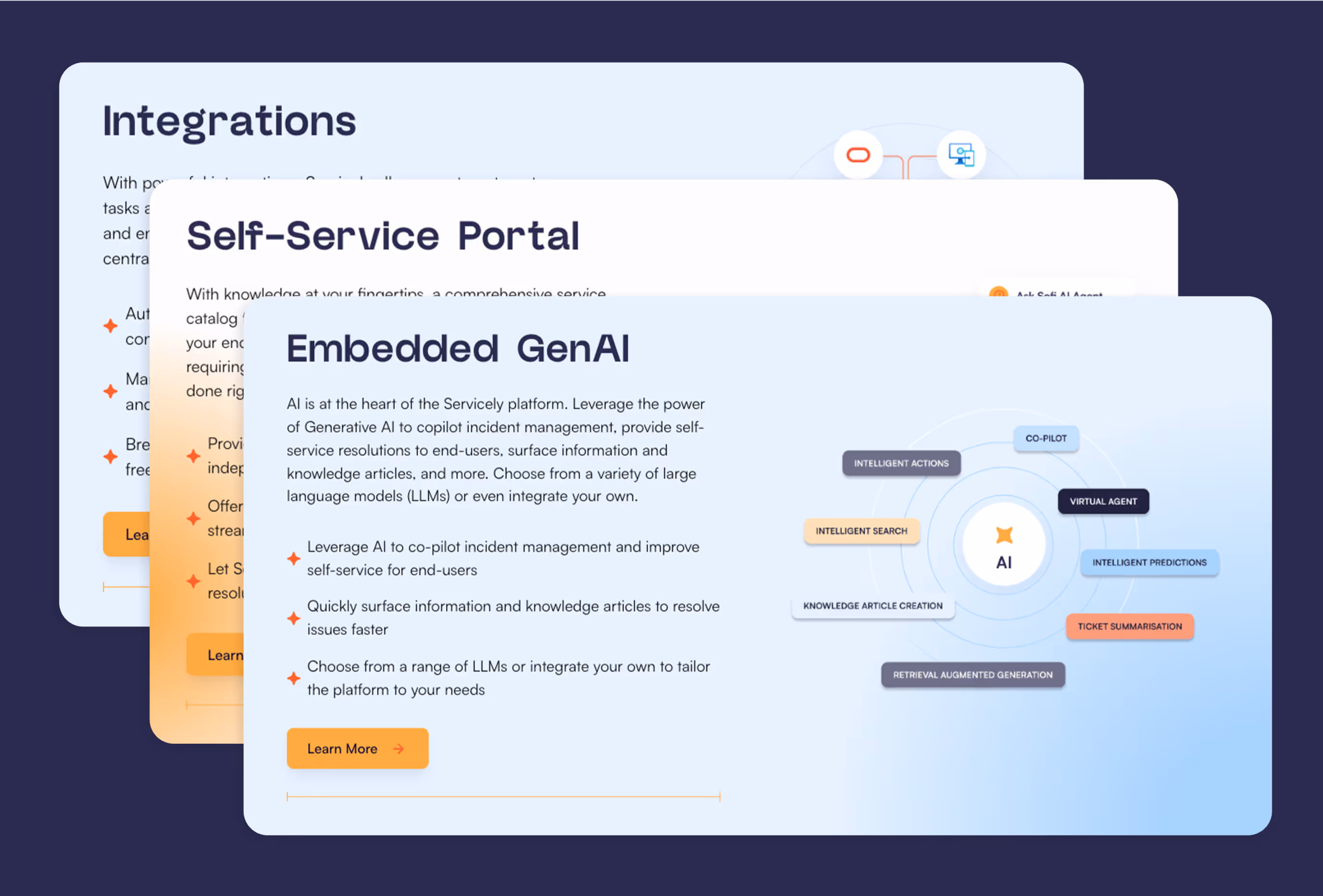 To support the depth Servicely and bring consistency across a complex site, we designed a custom suite of icons from the ground up. Simple, scalable and purposeful, each icon was crafted to feel intuitive at a glance, while carrying through the brand’s colour palette and confident, slightly playful tone.