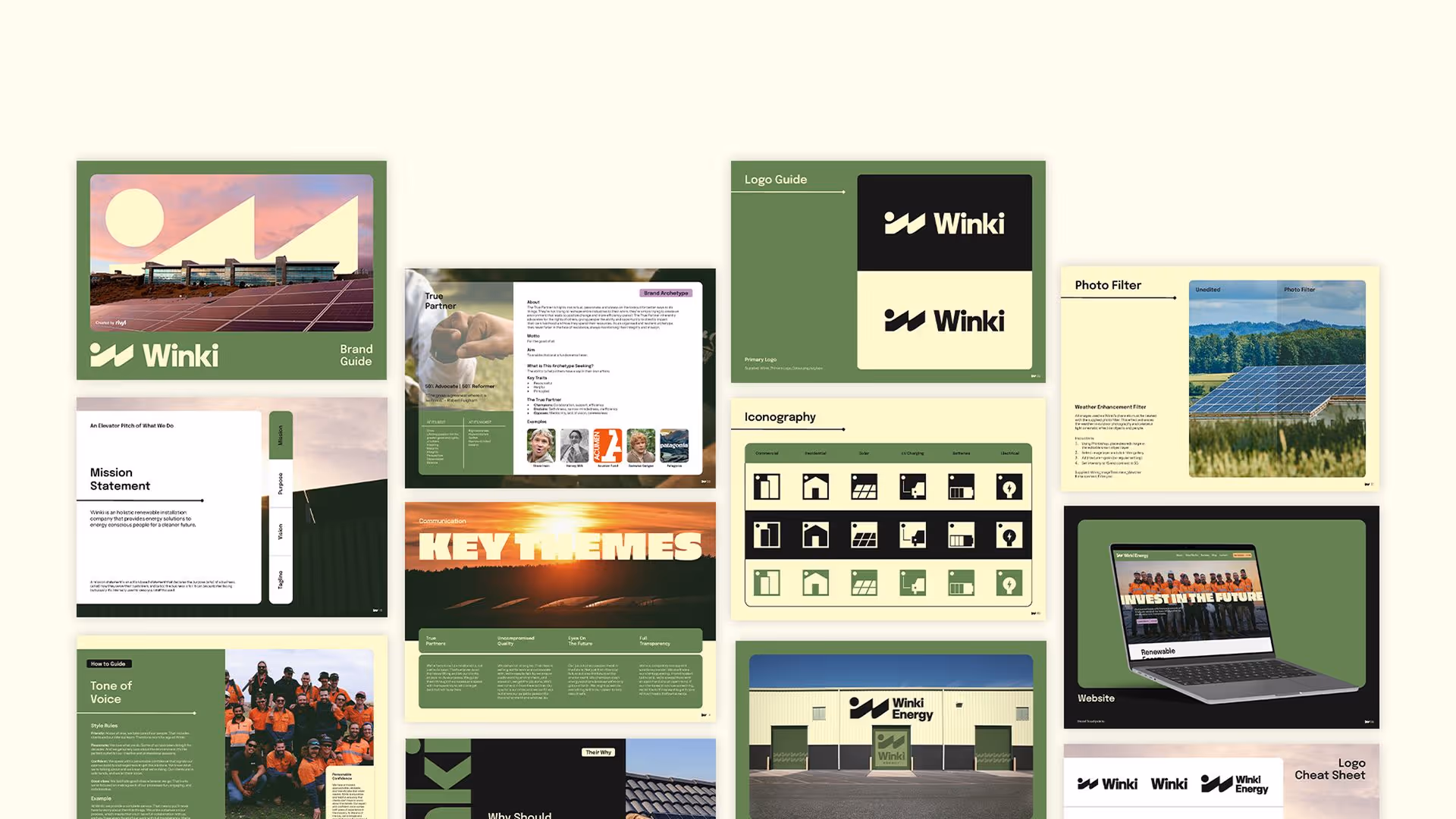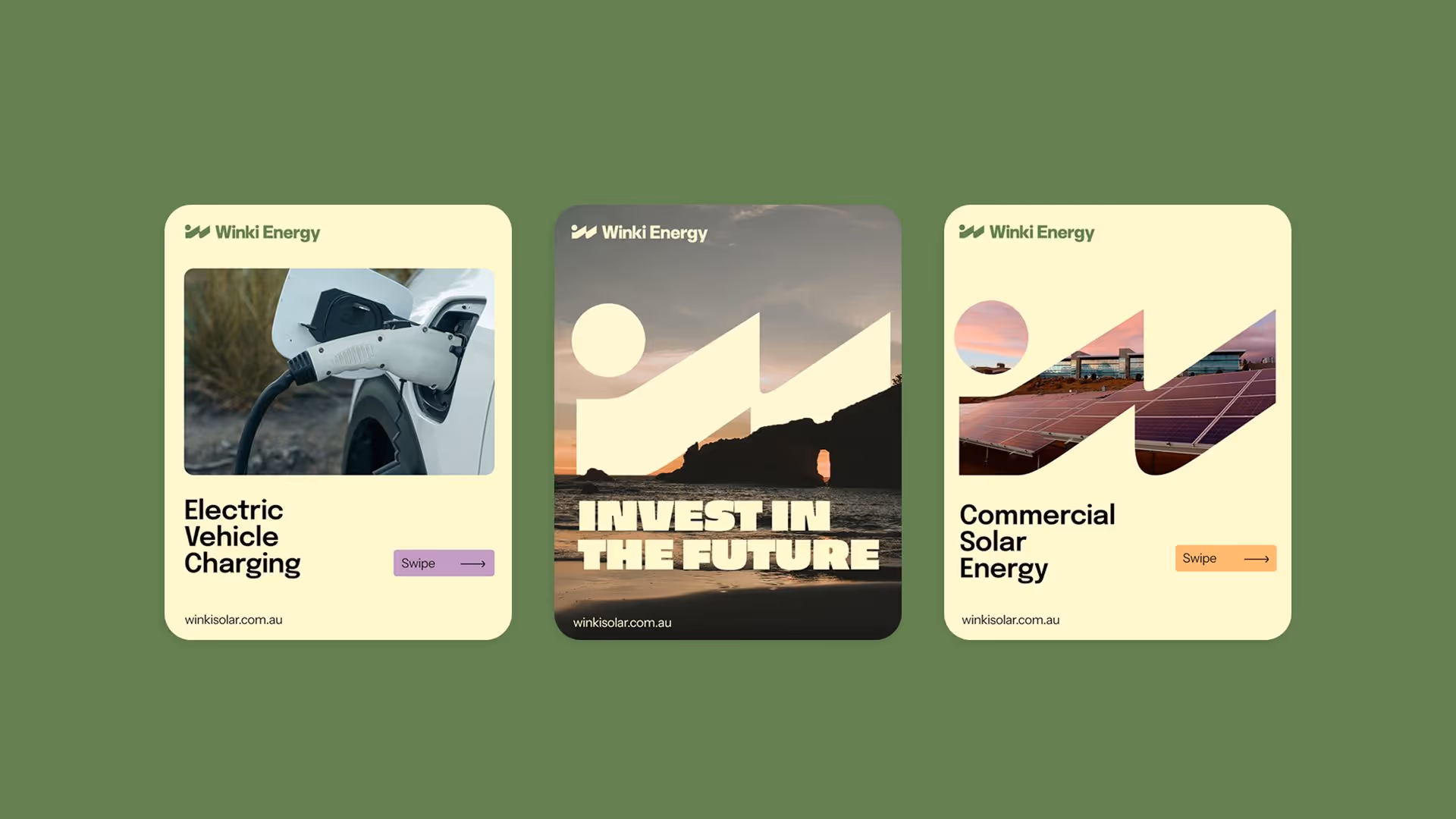 The Winki identity takes its cues from the natural world, inspired by coastal sunsets, clean energy, and the laid-back vibe of beachside living. The palette is warm and grounded, with sun-soaked imagery and nature-inspired tones.
