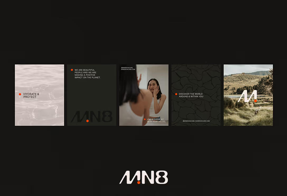 MN8 is a premium New Zealand skincare start up powered by full-spectrum Mānuka Gold Extract™. A potent, CO₂-extracted formulation developed from plants grown on a regenerated Northland dairy farm. Built on a mission to restore land, skin and confidence, MN8 merges modern science with nature’s complexity to deliver high-performance skincare with real purpose. From the ground up, we shaped MN8’s bold, regenerative vision into a cohesive brand that feels premium, powerful and deeply connected to the land it comes from.